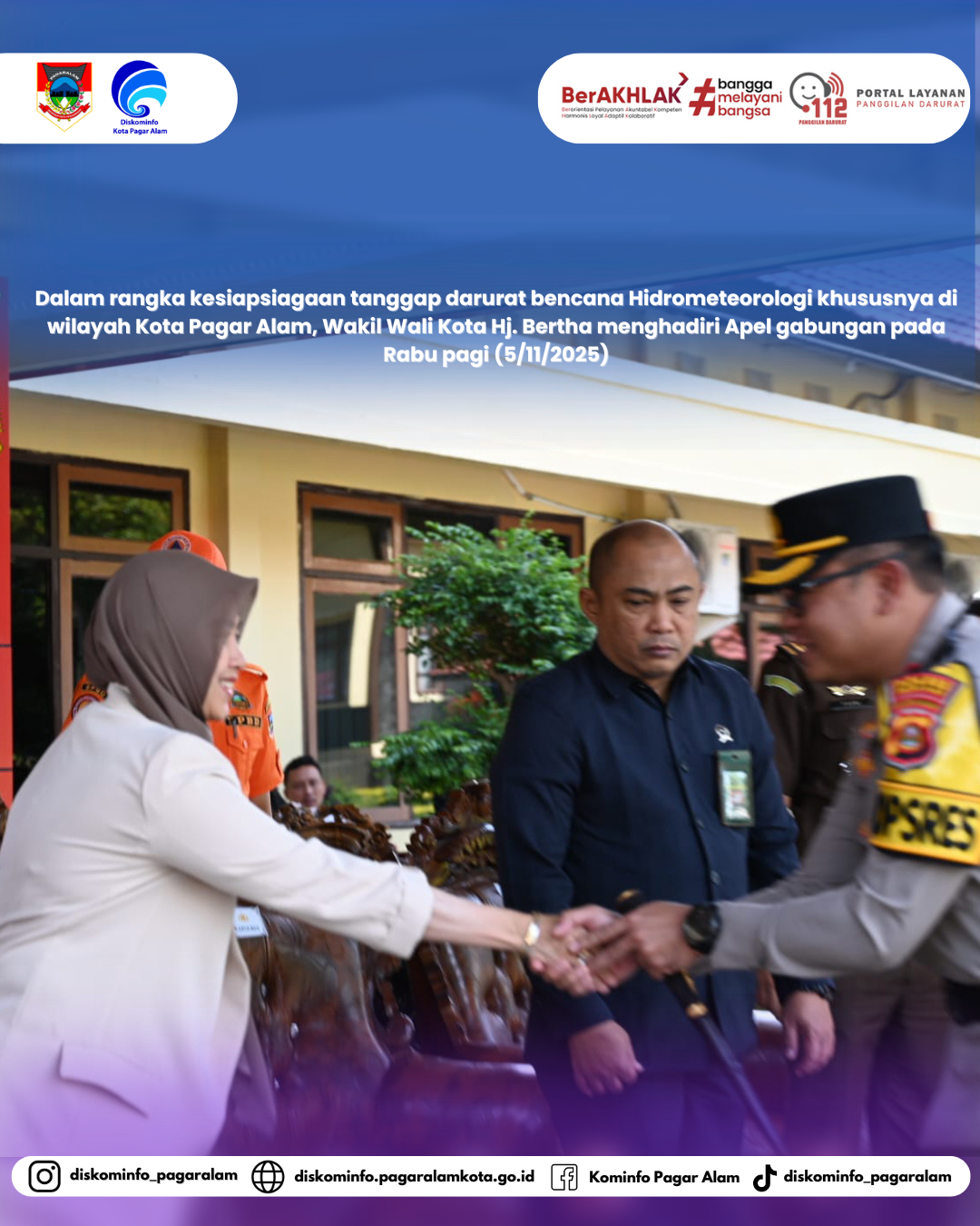 Dalam rangka kesiapsiagaan tanggap darurat bencana Hidrometeorologi khususnya di wilayah Kota Pagar Alam, Wakil Wali Kota Hj. Bertha menghadiri Apel gabungan pada Rabu pagi (5/11/2025)